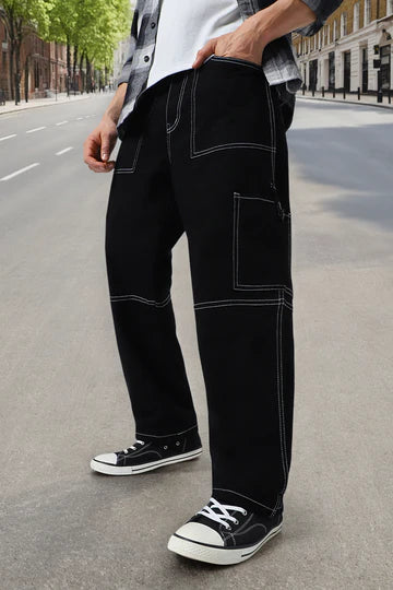 Men's Black Loose Baggy Fit Washed Cargo Jeans with 6 Pockets Non-Stretchable